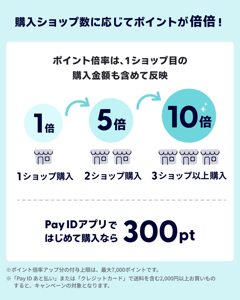 【Pay IDアプリ限定】Pay ID ポイント・最大10倍 購入したショップ数が増えれば増えるほど、ポイントがたくさんもらえます