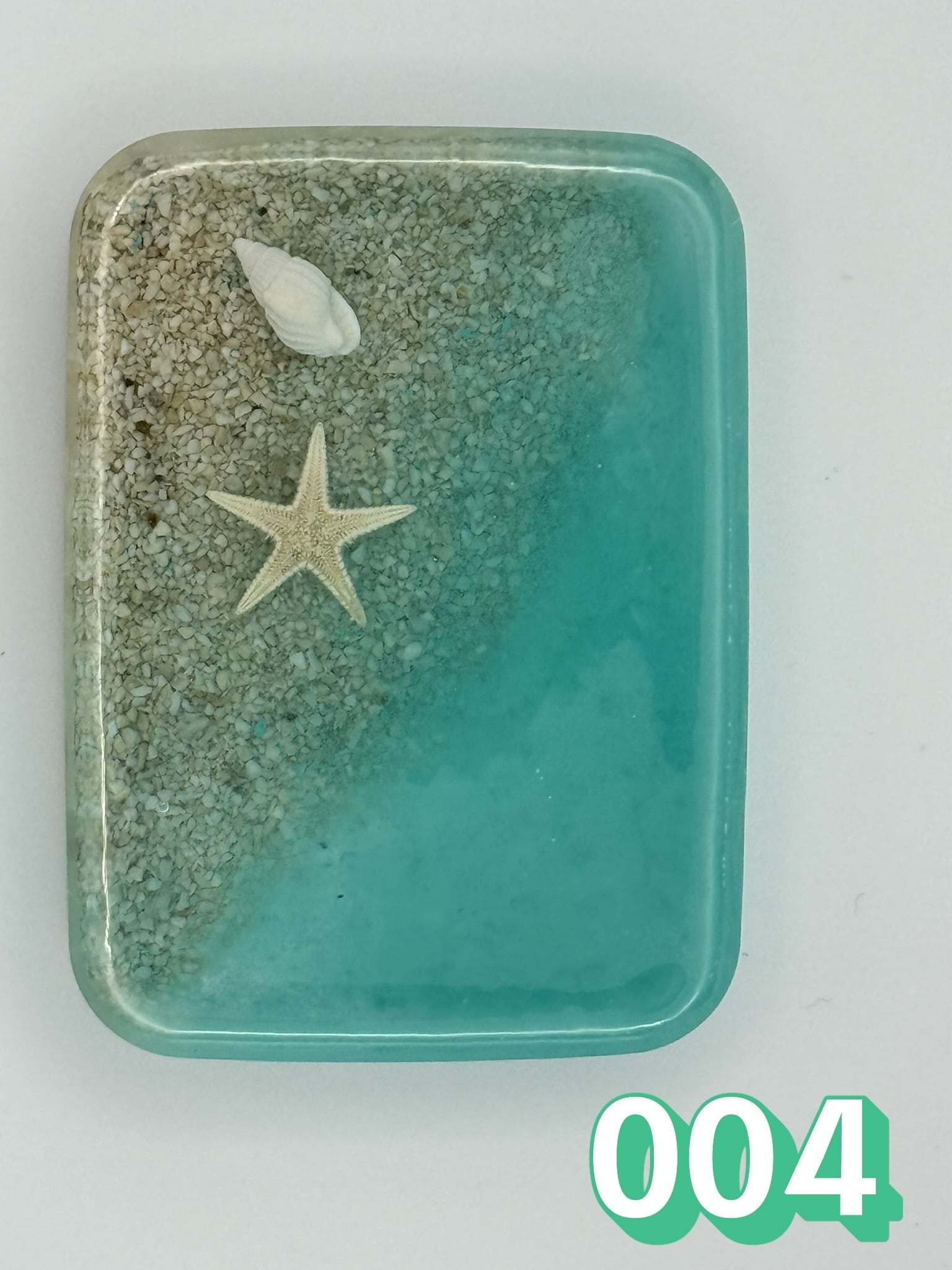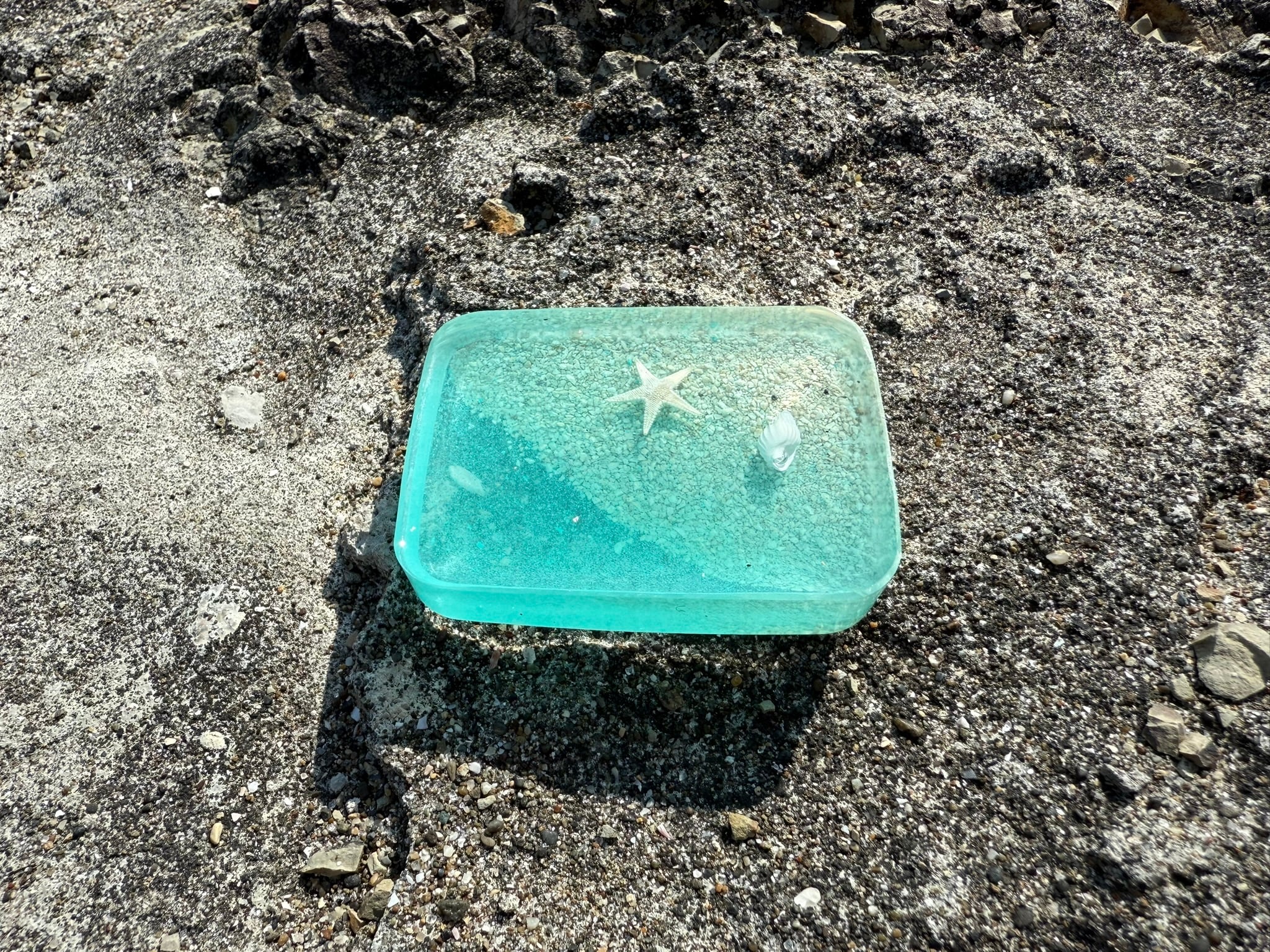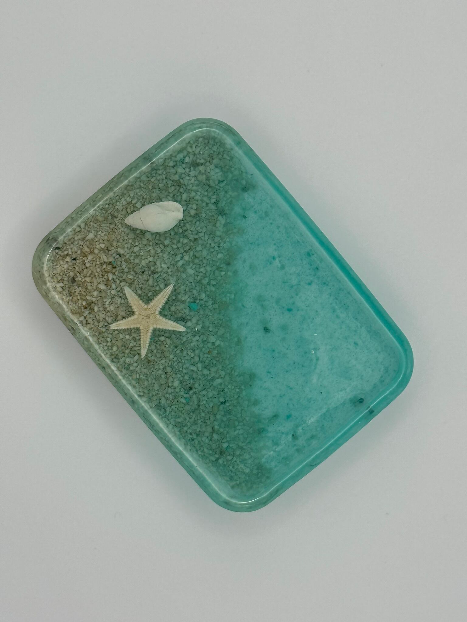 透明感のあるブルーのレジンに星砂と小さな貝殻を閉じ込めた、手のひらサイズのオーシャンアートです。