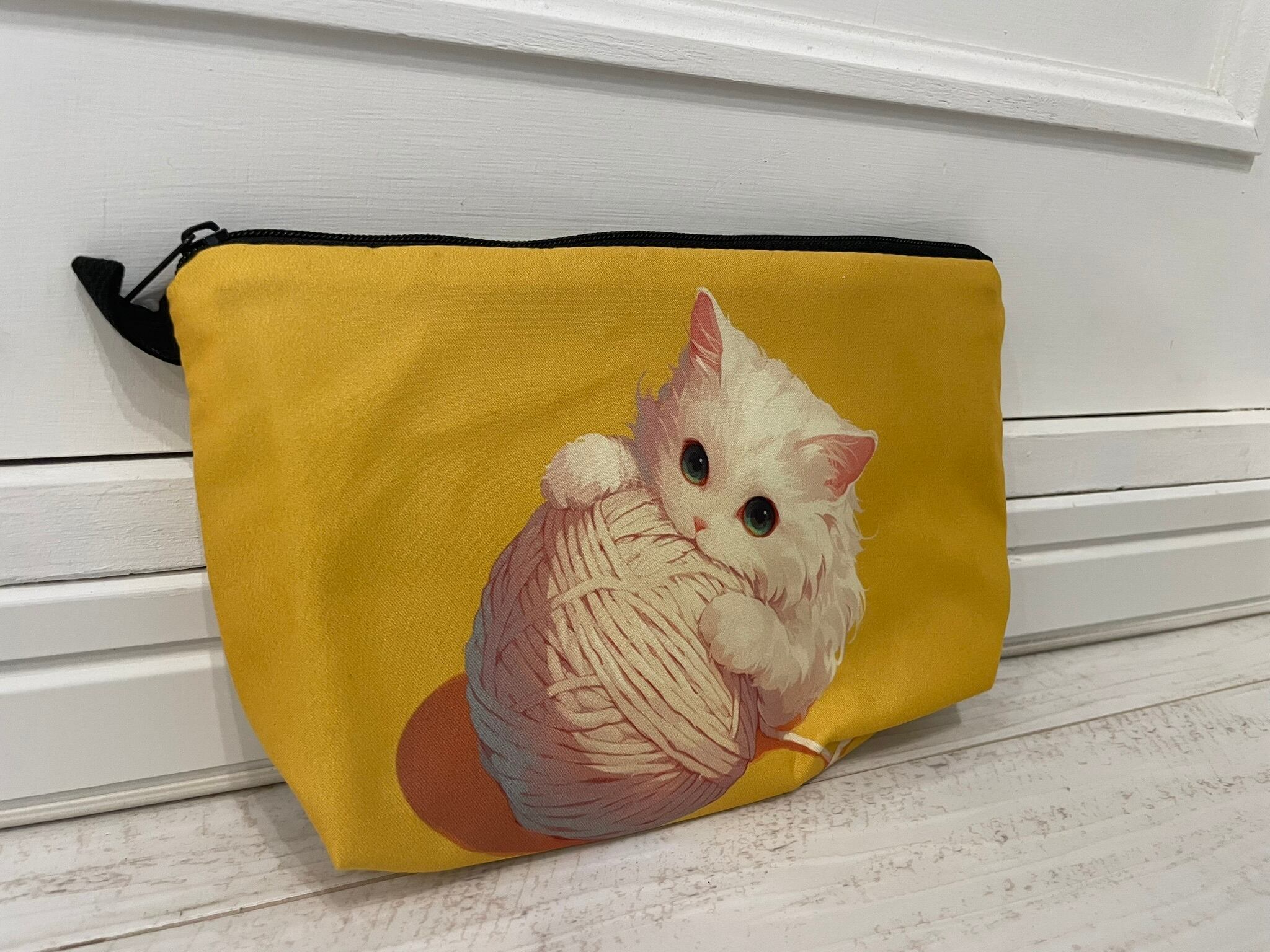 この愛らしい白猫のポーチは、見るだけで心が和むデザイン。ふわふわの毛並みと大きな瞳が特徴の白猫が、毛糸玉と一緒に描かれていて、持っているだけで楽しい気分になります。